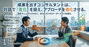 「黒子型」コンサルタントの最大の特徴は、提案だけでなく実行まで伴走することです。現場に入り、社員と共に考え、時には自ら手を動かします。