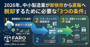 ファロ・コンサルティングは、単なるアドバイザーではありません 。代表自身が中小企業の経営者として、資金繰りの恐怖や下請けの痛みを泥臭く経験してきたからこそ、机上の空論は語りません 。 私たちはあなたの会社の「社外経営企画室(右腕)」として現場に入り込みます 。戦略の立案から、共に手を動かす実行支援までを黒子として伴走し、「魚の釣り方」をお伝えします 。最終的には、コンサルタントがいなくても自社内でマーケティングが回り続ける「自走化(内製化)」の実現をお約束します 。